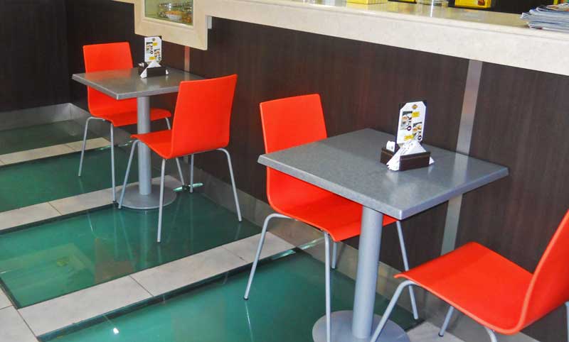 Estas son las sillas y mesas a medida con las que SujetoDeco equipó todo el local. En la fotografía podemos apreciar algunas de ellas.