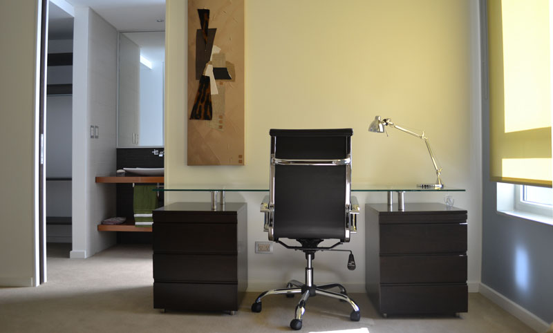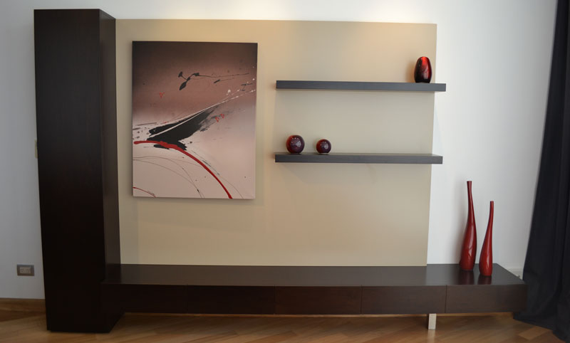Este modular a medida minimalista está decorado a juego con la tapiceria del sillón. Acompañado de una obra de Susana Cikurel.