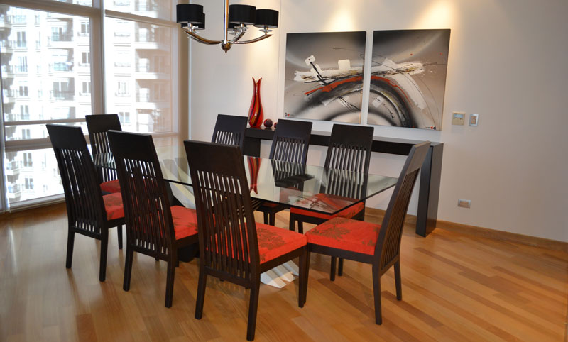 Elegante comedor con mesa a medida central acompañada de un juego de ocho sillas tapizadas en chenille muy confortables.