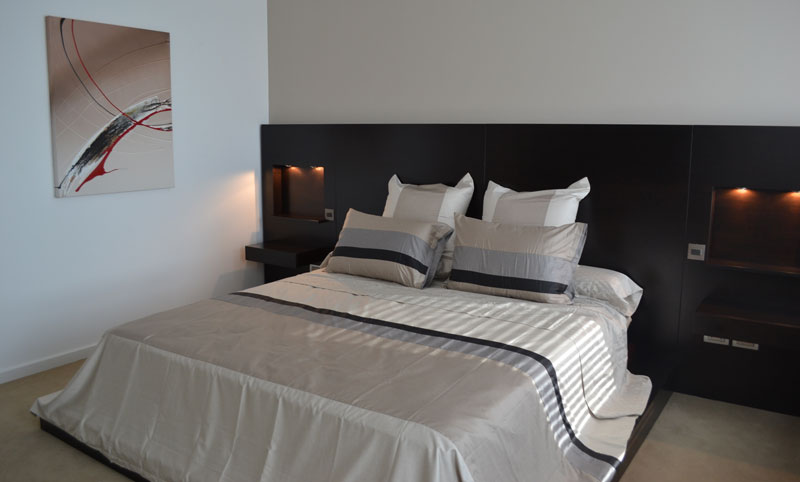 Dormitorio a medida con respaldo de cama y luz integrada, realizado con maderas y lustres de alta calidad. La decoración es de Susana Cikurel.