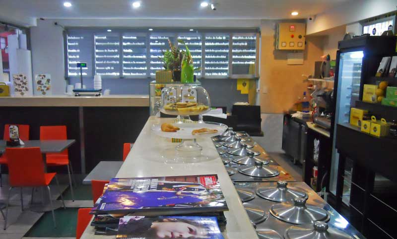 Todo el equipamiento se realizó a medida, como siempre cuidando los detalles de calidad, fabricación y terminación. Se equipó el local con mesas, sillas, muebles realizados en melamina, mármol y zócalos de acero inoxidable.